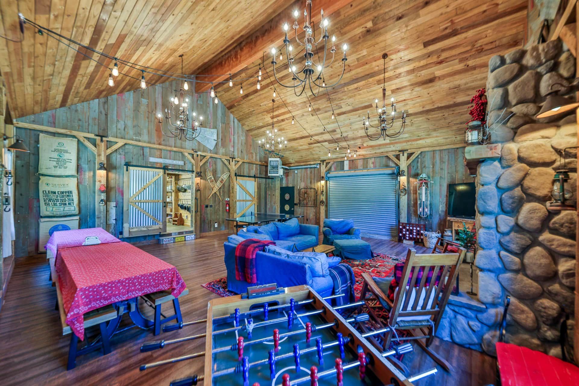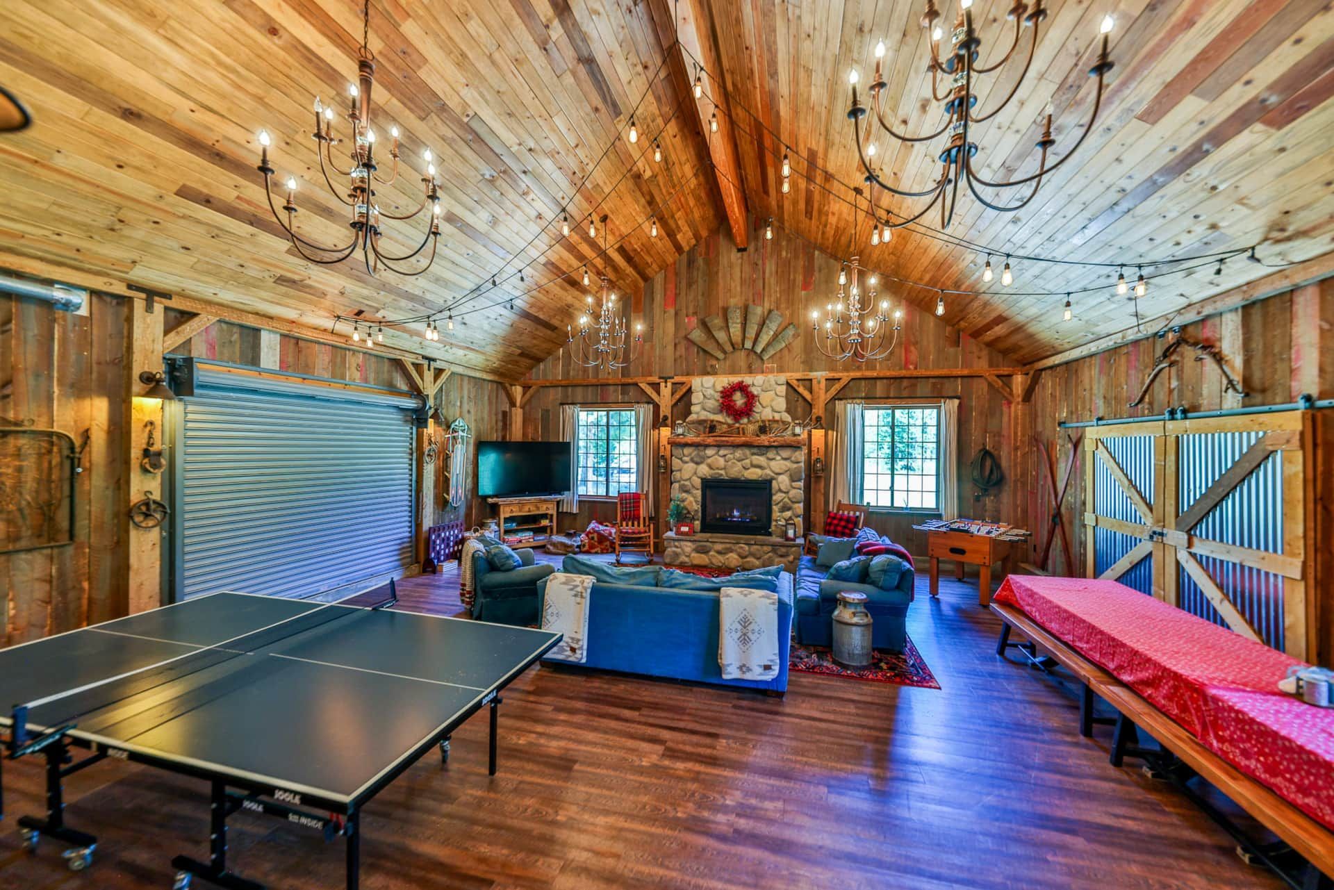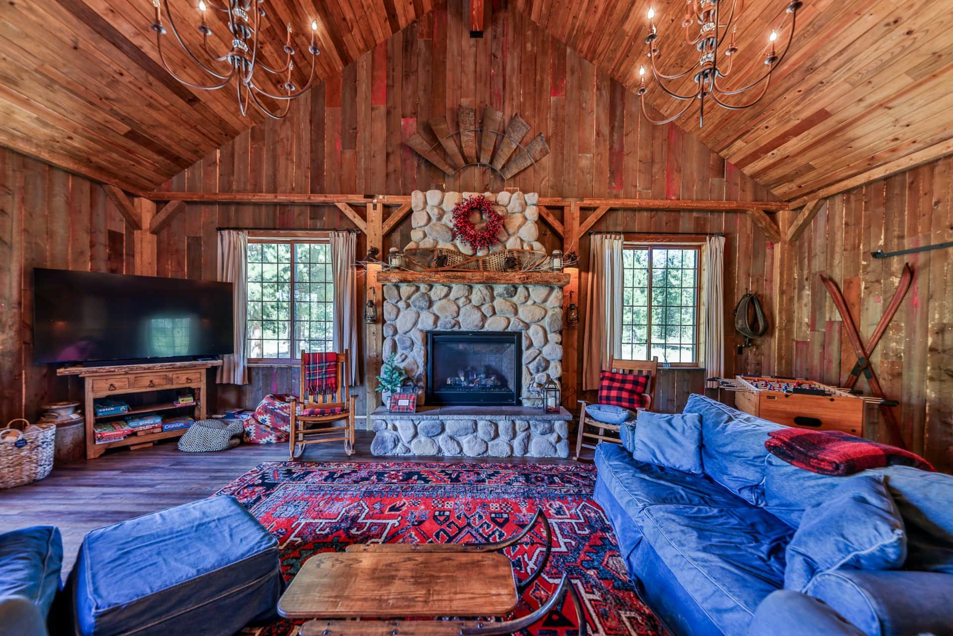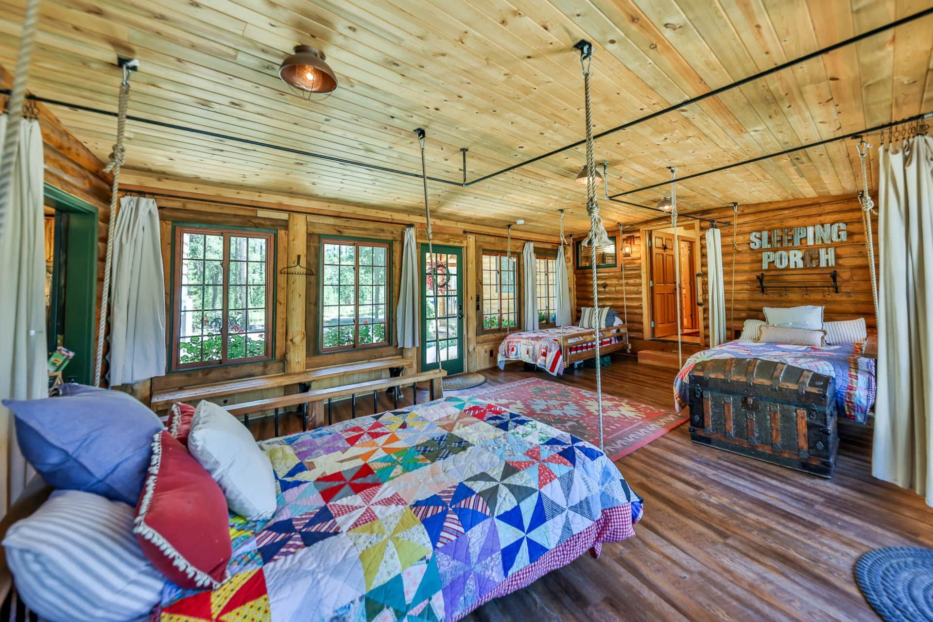 RiverSong isn’t just a place to stay—it’s a private micro-resort designed for making lifelong memories. The lodge features 6+ bedrooms with 17 beds, a massive two-story rec room, and spacious decks overlooking the river. Inside, you'll find two fully equipped kitchens, multiple dining areas (seating for up to 22), and cozy living spaces with fireplaces. Enjoy the heated enclosed sleeping porch with hanging beds, perfect for lounging or stargazing to the soothing sounds of the river.