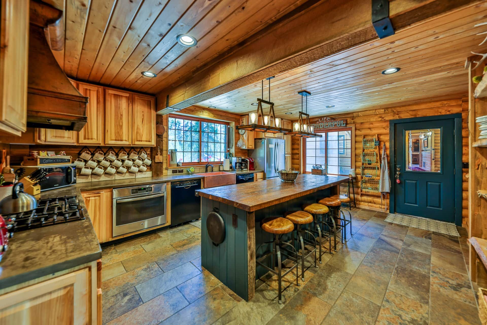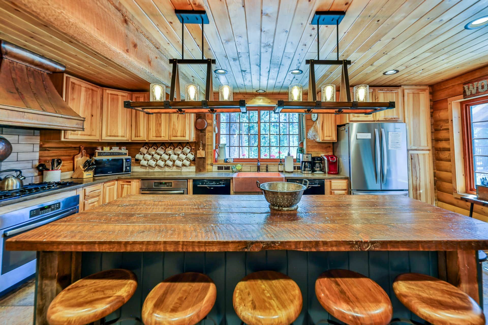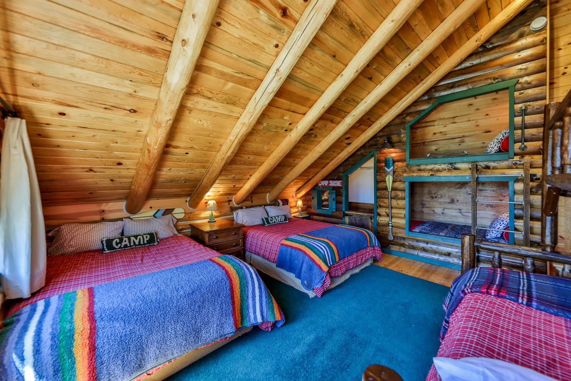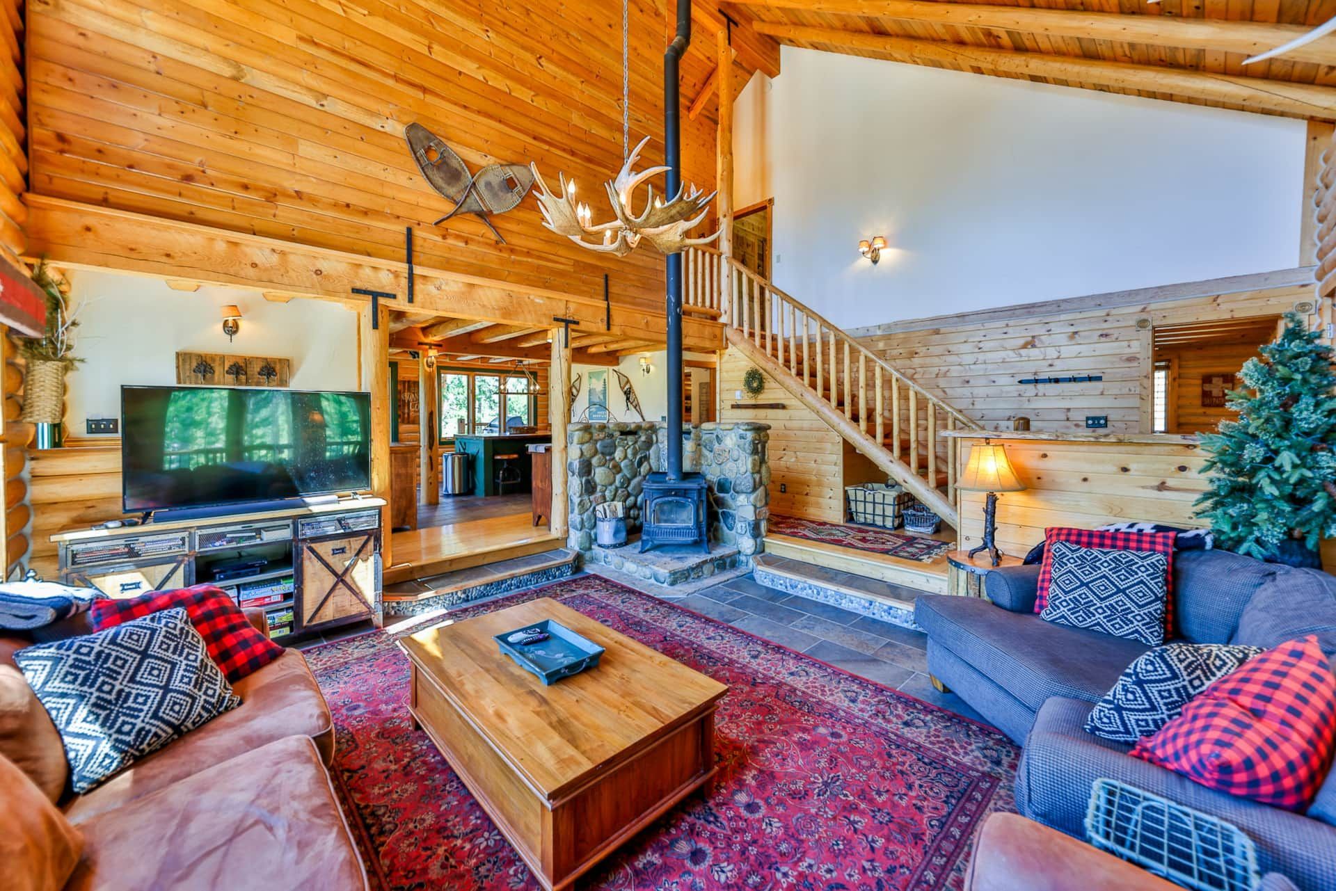 RiverSong isn’t just a place to stay—it’s a private micro-resort designed for making lifelong memories. The lodge features 6+ bedrooms with 17 beds, a massive two-story rec room, and spacious decks overlooking the river. Inside, you'll find two fully equipped kitchens, multiple dining areas (seating for up to 22), and cozy living spaces with fireplaces. Enjoy the heated enclosed sleeping porch with hanging beds, perfect for lounging or stargazing to the soothing sounds of the river.